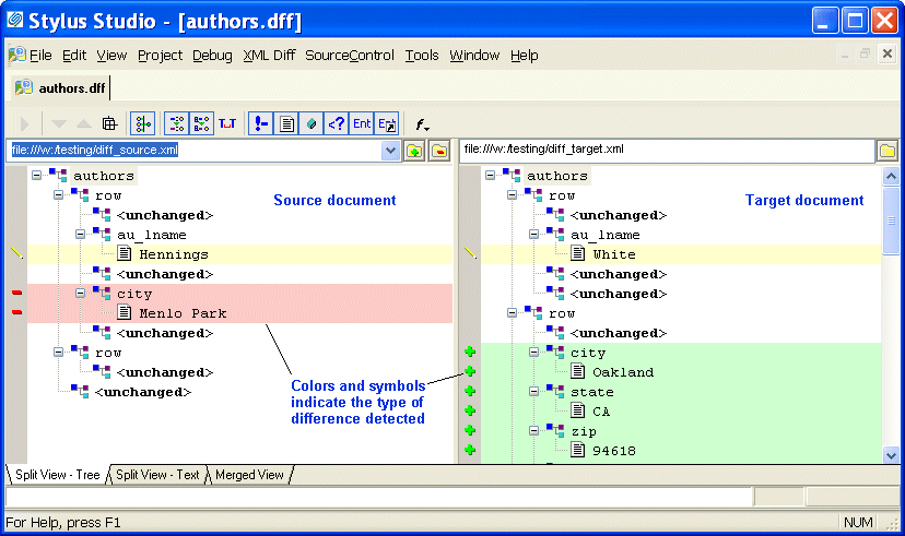 Customizable color-coding lets you quickly determine how one document differs from another - green, for example, identifies objects (such as elements and attributes) that are present in the target document, but which do not exist in the source document. When you hover the pointer over symbols displayed in the side bars of the source and target document windows, Stylus Studio displays a tool tip that indicates the specific nature of the change.