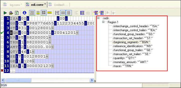 The schema pane displays a representation of the XML Schema for the XML document that will be output when the input file is converted to XML.