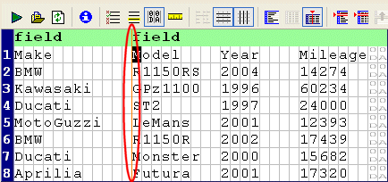 Each field you define is treated as a separate element in the XML output by the custom XML conversion definition. The input file shown in Figure 175, for example, would result in XML with two <field> elements, one consisting of the make of motorcycle, and one consisting of the model, year, and mileage. You can use the field feature to exercise control over the XML - defining separate fields for make, model, year, and mileage, for example.