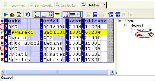 When you define multiple match patterns, the document pane displays a gray square alongside rows that match a pattern other than the one, if any, associated with the currently selected row. In Figure 178, for example, row 3 is the currently selected row; it matches the pattern ^K we have defined. Because row 3 is the active row, Stylus Studio displays gray squares in rows 2 and 6 (which match the pattern B defined previously).