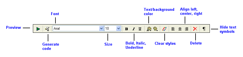 The buttons in the XML Publisher toolbar let you specify formatting for the component or piece of text in the canvas that has focus. It also lets you preview the report and generate code for it.
