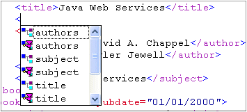 In addition to auto-complete for element names, Sense:X can generate an entire XML subtree based for a given element. As you type, Stylus Studio displays a drop-down list with valid choices based on the current context.