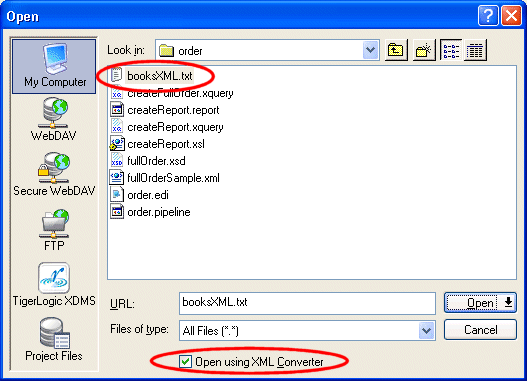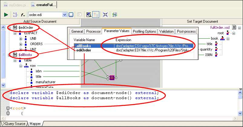If you open createFullOrder.xquery, which is in the pipelines\order folder of the examples project where you installed Stylus Studio, you can see how this was done. As shown in Figure 429, createFullOrder.xquery uses variable declarations, $ediOrder and $allBooks, for the non-XML data sources. DataDirect XML Converters, which are built in to Stylus Studio 2009 XML Enterprise Suite, convert these data sources to XML on-the-fly, any time the XQuery (or an XML pipeline that uses the XQuery) is executed. Thus, if the data in either booksXML.txt and order.edi changes, the report resulting from the XML pipeline will change, too.