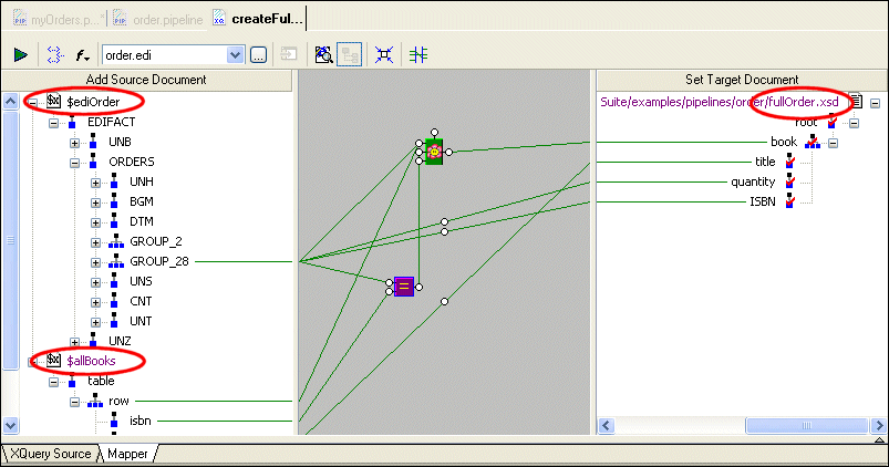 To join data from these different documents we will use an XQuery document created using the XQuery Mapper. Once we have defined that XQuery document, we can add the XQuery node to our XML pipeline.
