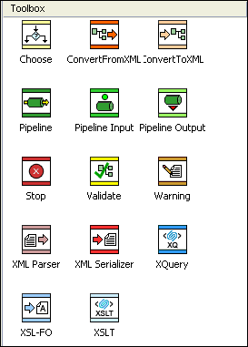 To create a node in an XML pipeline using the Toolbox, just drag an icon from the Toolbox pane and drop it on the XML pipeline canvas.