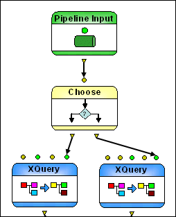 The Choose node can have one or more input ports; by default, it has a single input port, named Input #0. You use the XPath # property to express a "true" condition - that is, a condition that must be met in order for processing to continue. The Choose node in retrieveData.pipeline, for example, uses the XPath expression . castable as xs:double to check whether or not the user ID it is given as its input is numeric.