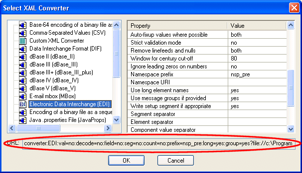 The value in the URL field changes when you select an XML Converter. Properties and their settings (like decode=no in Figure 453) are displayed only if you change a default value.