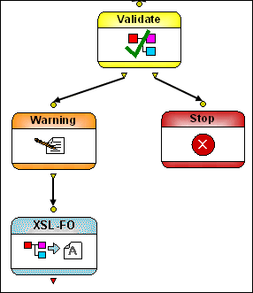 Figure 454, for example, shows a Stop node piped to the Output invalid output port of the Validate node - if the validation using the XML Schema specified in the Validate node fails, the Stop node aborts XML pipeline processing, and a user-defined error message is generated. Stop nodes do not have an output port - XML pipeline processing ends if it encounters a Stop node.
