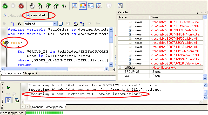 ), or by pressing F11. When we step into a node, Stylus Studio opens the document the node represents (in this case, createFullOrder.xquery) in its own editor.