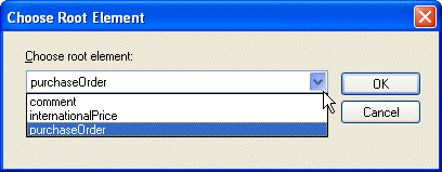 The Choose root element drop-down list displays all the child elements of the XML Schema or DTD document you selected as a data souce. Select the element you want to use as the document root and click OK.