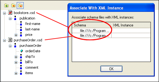 Each entry in the Schema field represents an XML Schema or DTD document used as a data source. To associate it with an XML instance: