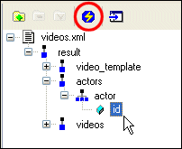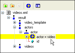 If you place the mouse over the outer loop, the tool tip displays the XPath - /result/actors/actor; similarly the XPath for the inner loop is /result/videos/video[$actor/@id./actorRef].