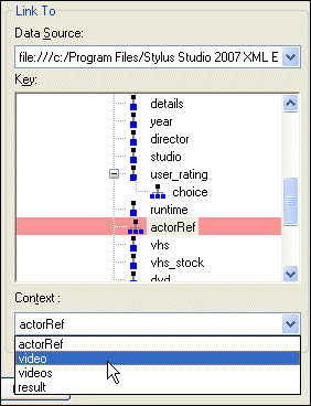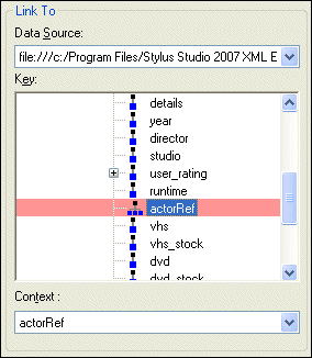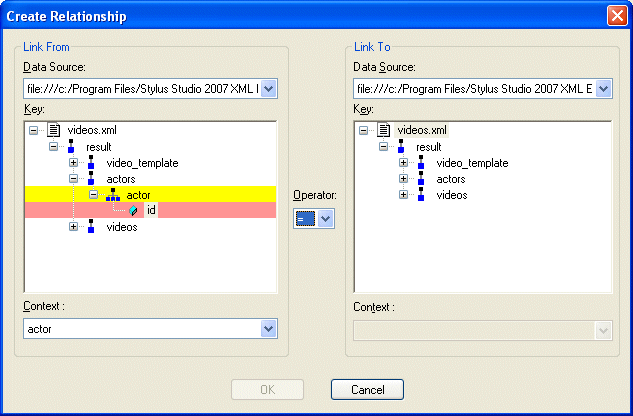 If you expand the relationship node, you see the graphic representation of the join formed between the actors/actor/id node and the videos/video/actorRef node.