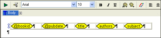 For this example, we use books.xml as the report's data source. When we drop the book repeating element on the canvas, we select Insert Table > Populated Columns from the short-cut menu. Stylus Studio creates a table with five columns, one for each of the child nodes in the book repeating element, as shown in Figure 490.