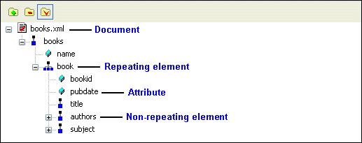 As described earlier, the data source - whether it is an XML document, a relational database table, an EDI file converted to XML, or some other XML data source - is represented as a data model in the data sources panel. The glyphs used for the nodes are based on the object they represent in the data source, as shown here.