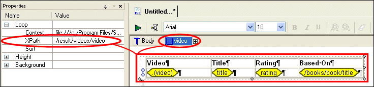 The context for the table component shown in Figure 490 is the video repeating element from the videos.xml document. You can see this if you select the table in the canvas and look at either the