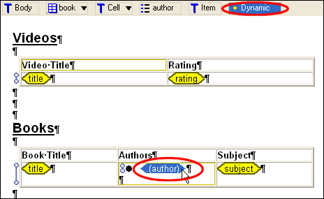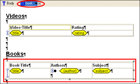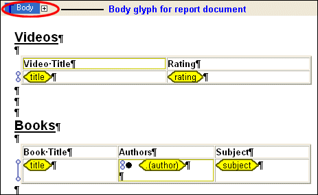 The plus sign next to the Body glyph indicates that the report body has at least one child. Our report has two children - the table containing video data, and the table containing book data. If we click the plus sign, Stylus Studio displays a drop-down menu that lists the children of the report body, and we see the entries for the video and book tables.