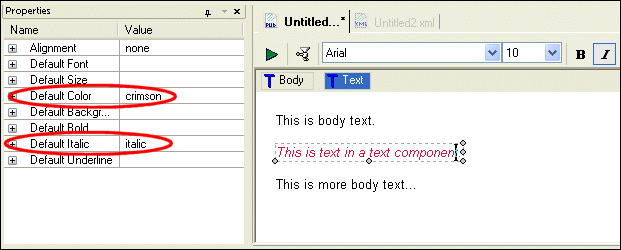 Text components and body text have the same properties (Alignment, Font, Color, Size, and so on).