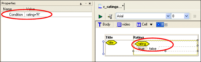 We need to create a report that contains a simple table that lists the title and rating for all movies in the videos.xml document. In addition, if the movie carries an `R' rating, we want to display the R-rated symbol (