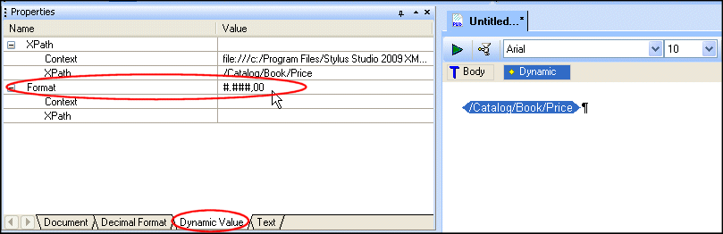 You specify the picture string in the Format property on the Dynamic Value tab for the report component - the Price node, in the following illustration - whose number strings you want to format. You must specify a picture string for any number strings you want formatted using the values you define on the Decimal Format tab. If you do not specify a picture string, no formatting is applied to the number string and it is rendered in the finished report as-is.