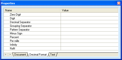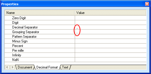 For example, if you want decimal values to be separated by a comma (,) instead of a period (.), you would enter a comma in the Value field for the Decimal Separator property. Default values are used for any properties that you do not specify. See Table 177, Decimal Format Properties on page 1113 for more information.