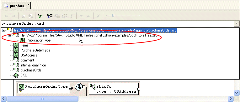 If you select a referenced schema from the definition browser, as shown in Figure 302, Stylus Studio changes the diagram view to display the referenced schema's structure. If you selected a redefined XML Schema, for example, you could modify its complexType definitions there.