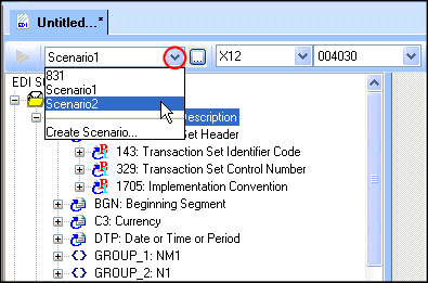 As you create new scenarios, they are listed in the Existing Scenarios field. The scenario selected in this list is the active scenario - when you preview the EDI to XML conversion, the active scenario is the one that is being run. You can specify a different active scenario by selecting it in this list, but it can be more convenient to select it from the Create Scenario from the scenario drop-down list on the EDI to XML editor tool bar: