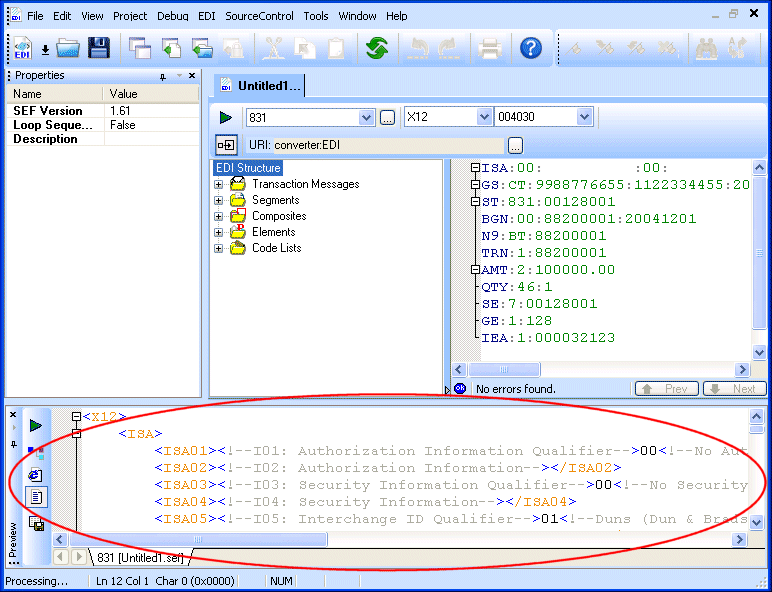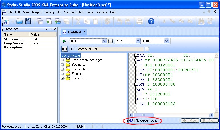 831.x12 EDI file you selected in step 2 is displayed in the EDI document pane. The message in the status bar (No errors found) indicates that the 831.x12 EDI file has no errors.