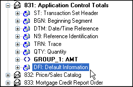 All imported definitions - whether imported implicitly (by changing a property, for example) or explicitly - are displayed in bold text in the EDI Structure pane. In the following illustration, for example, the segment reference DFI: Default Information has been added to the transaction message 831: Application Control Totals.