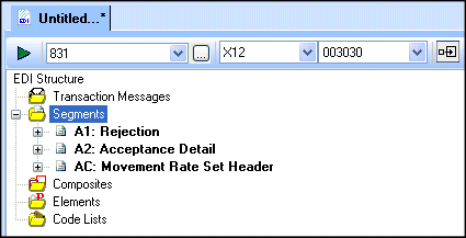 As you build your EDI to XML conversion and make changes to the EDI standard, you might want to simplify the view in the EDI Structure pane to display only those local definitions. In the following illustration, the segments A1, A2, and AC have all been imported from repository. These definitions, which are shown in bold, reside in the SEF file that represents your EDI to XML conversion.
