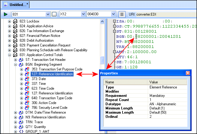 The Properties window, like the one shown in the following illustration, allows you to edit properties associated with the definition in the EDI Structure that currently has focus.