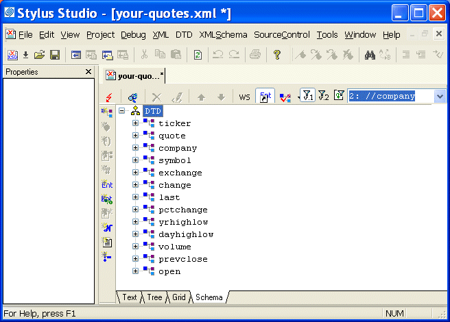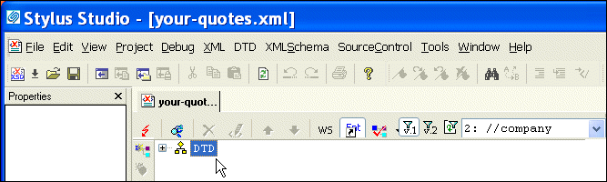 Stylus Studio displays the Schema tab, and opens the Properties window. The Schema tab displays a DTD tree, which is currently empty.