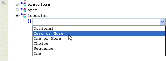 Stylus Studio displays an entry field for the new modifier at the end of the list of modifiers that already apply to the Sequence modifier. The entry field consists of a drop-down list of available values for the new modifier.