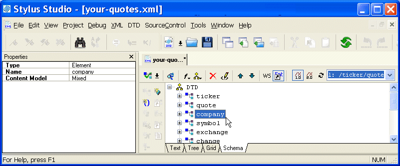 This topic is part of a sequence. If your-quotes.xml is not open, see Opening a Sample XML Document. The sequence starts with Creating a Sample Schema.