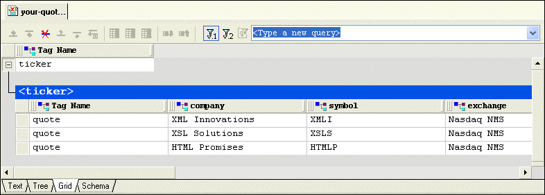 This section provides instructions for updating the your-quotes.xml document using the Grid tab of the XML Editor. The Grid tab is useful for displaying structured data. It is a convenient way to view a document that contains multiple instances of the same type of element, for example.