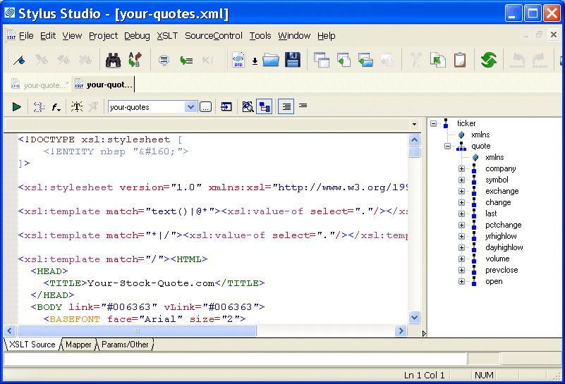your-quotes.xsl document in the XSLT Source tab of the XSLT editor.As with the XML Editor, Stylus Studio uses different colors to distinguish markup, tag names, and data in the XSLT Editor.