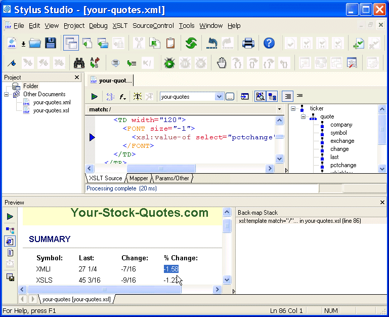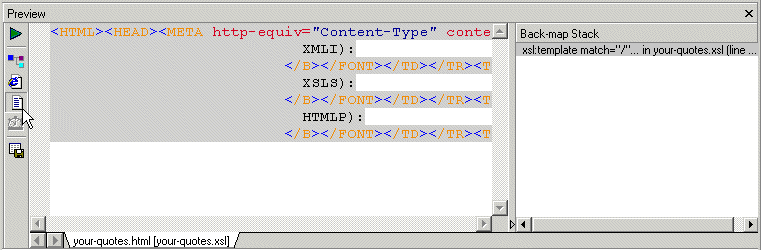 Using its back-mapping functionality, Stylus Studio displays the template in the XSLT Editor's status bar and flags the line that generated the line you clicked with a blue pointer.