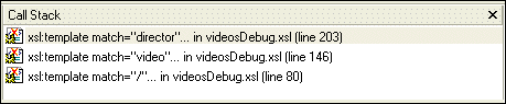The Call Stack window displays a history of the steps the processor performed to reach the point at which processing was suspended, including the names of the templates that are currently instantiated, in most recent-to-oldest order.