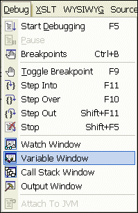 When XSLT processing is suspended at a breakpoint, Stylus Studio displays the Variables, Call Stack, and Watch windows.