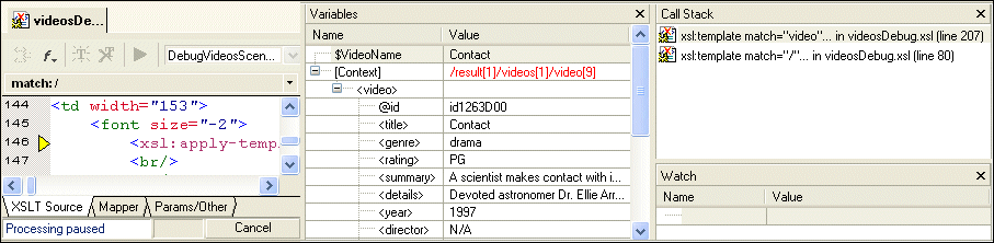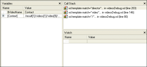 As you can see in the Call Stack window, the processor is now two levels deep in the template that matches the root node, instead of three levels deep as it was previously. The value of the context node in the Variables window is /result[1]/videos[1]/video[9] (it was /result[1]/videos[1]/video[9]/director[1]).