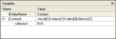 As you can see, the stylesheet defines the VideoName parameter, which had no value when processing was suspended. In addition, the Variables window shows you that when processing was suspended, the processor was operating on the first director child element of the first video child element of the first videos child element of the first result element.