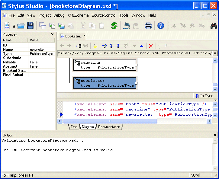 In the final step of defining bookstoreDiagram.xsd, you define elements that are of the PublicationType complexTypes you defined earlier - book, magazine, and newsletter elements.
