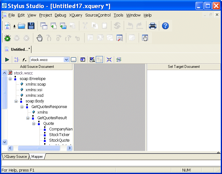 In addition to opening a Web service call in the Web Service Call Composer for testing purposes, you can open a Web service call as an XML document anywhere in Stylus Studio - in the XML editor, or as a source document in the XQuery mapper for example. When you open a Web service call as an XML document, Stylus Studio automatically executes the SOAP request and displays the SOAP response.