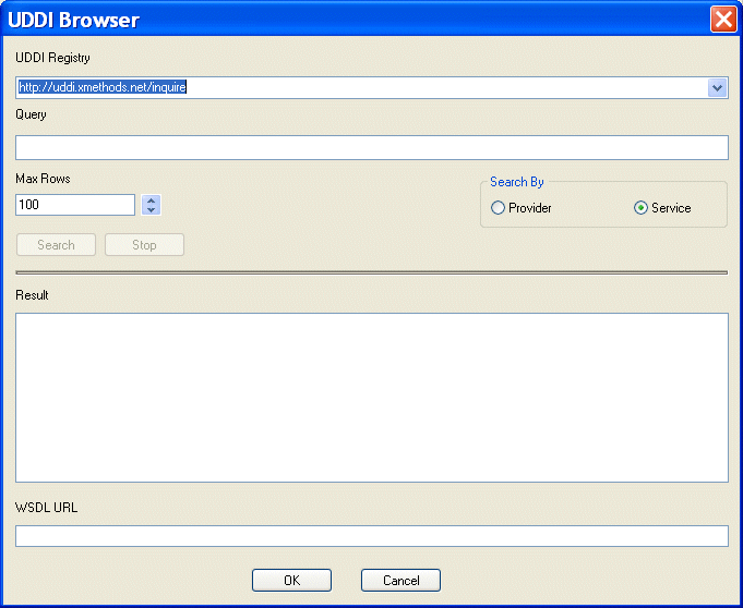 If you do not see a suitable WSDL URL in the UDDI registry you searched, modify your query in the UDDI Browser and try your search again, or search a different UDDI registry.