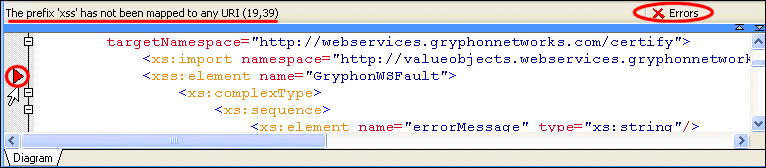 When you click the error message, Stylus Studio jumps to that part of the WSDL document containing the error. When you correct one error, information about the next error detected by Stylus Studio (if any) is displayed in the status area.