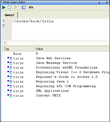 Query results are shown in the XPath Query Editor in the results pane as a number of hits and include the type of XML tag and value of each hit, as shown here.