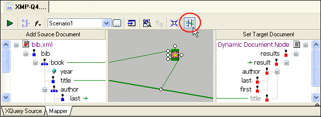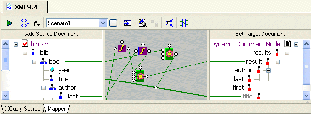 By default, the XQuery Mapper displays all links between source and target document nodes, regardless of whether or not the node associated with a link is currently visible in the Source Document or Target Document pane. Further, as your XQuery code becomes more complex, the mapper canvas can become dense with graphical representations of the functions defined in the code and the links that represent them. Consider this example of XML-Q4.xquery, one of the sample XQuery files in the Examples project installed with Stylus Studio.