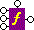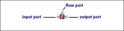 Function blocks are drawn as a purple block with an italic "f" at its center, and connectors, called ports, placed along the block's border. Input ports (none or more based on the function), the Flow port at the top, and the Return port on the right: