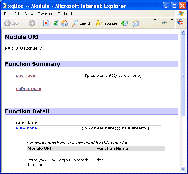 By default, xqDoc generates Module URI, Function Summary, and Function Detail sections for each XQuery, as shown in the following illustration.