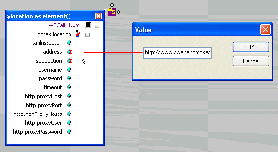 If we right-click the address node and choose Set Text Value, the Value dialog box displays the URL for the Swanand Mokashi Web service WSDL, as shown in Figure 381: